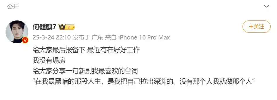 3月24日,何健麒在社交平台发文回应,否认“塌房”一说,称只是“恋爱中的正常闹别扭”,并无狗血剧情。随后还发文称:“给大家最后报备下,最近有在好好工作。我没有塌房。给大家分享一句新剧我最喜欢的台词,‘在我最黑暗的那段人生,是我把自己拉出深渊的。没有那个人我就做那个人。’”