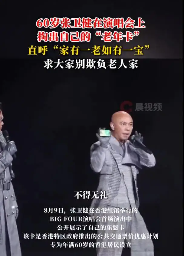 Yes娱乐8月11日讯 近日,60岁的香港知名男星张卫健在个人演唱会上妙趣横生,突然从口袋中掏出"老年卡"自嘲,引发全场爆笑。这位出道近40年的"不老男神"以幽默方式回应年龄话题,笑称:"以后看到我,记得尊老爱幼啊!"
