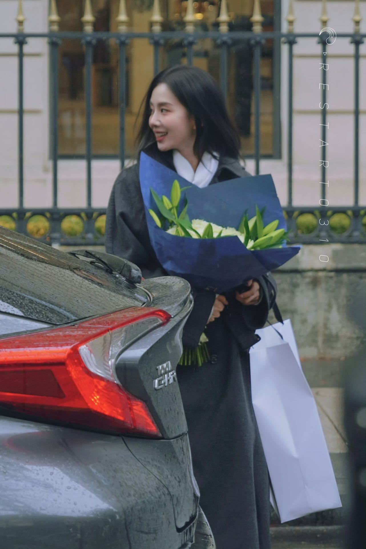 当她手捧一束洁白的百合花走在巴黎街头,淡妆却精致的面容与乌黑长发在阳光下显得格外清新,不经意间流露的温柔笑意,将东方女性的温婉气质与法式慵懒浪漫巧妙融合。
