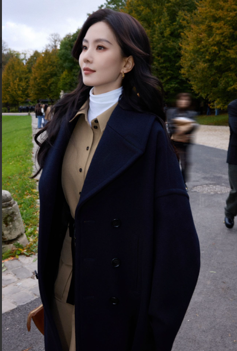 刘诗诗的巴黎闪耀时刻,早在机场出发便已开启。身着深蓝色CELINE垂感大衣的她,内搭黑色高领衫与牛仔裤,冷色调碰撞出极致高级感,利落剪裁强化的肩线与收腰设计,让苗条的身形穿出超模气场。