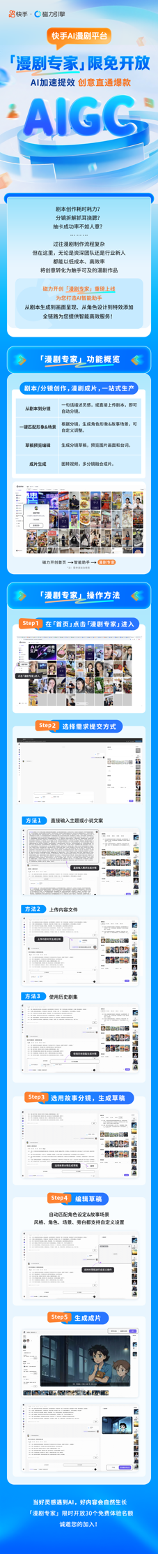 不仅如此,在AI技术的不断升级迭代下,快手正在构建一个覆盖“工具、内容、发行”全链路的漫剧生态。未来,快手也将持续打造多样AI智能产品,降低内容创作及经营门槛,助力更多内容消费行业伙伴实现从创意到收益的高效转化。