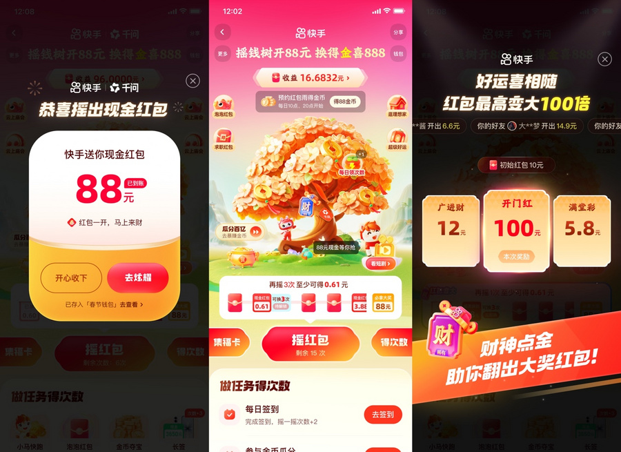 2月4日至23日,快手开启“摇一摇领红包”活动,用户完成全部进度红包,100%解锁后可获88元现金。2 月 15 日至 16 日迎来福利高峰。2 月 15 日辽宁卫视春晚期间,快手将发放专属红包雨,单场最高奖金达 10000 元;2 月 16 日除夕当天,全天整点红包雨持续上线,单场最高同样可赢 10000 元。