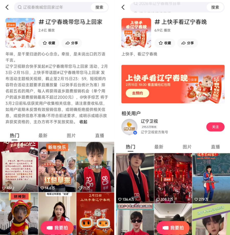 快手有年味,奔腾中国年。作为《2026辽宁春晚》冠名方,快手不仅为晚会营造围炉夜话般的亲切感,助力辽韵风华走向全国观众的心灵深处;还通过“专属红包雨”等大小屏互动玩法,把热闹欢腾从声光电舞台延伸到了天南海北。当天,@辽宁卫视 快手直播间观看人次达2.55亿,收获全网热搜817个,成为除夕前夜的人气聚集地。
