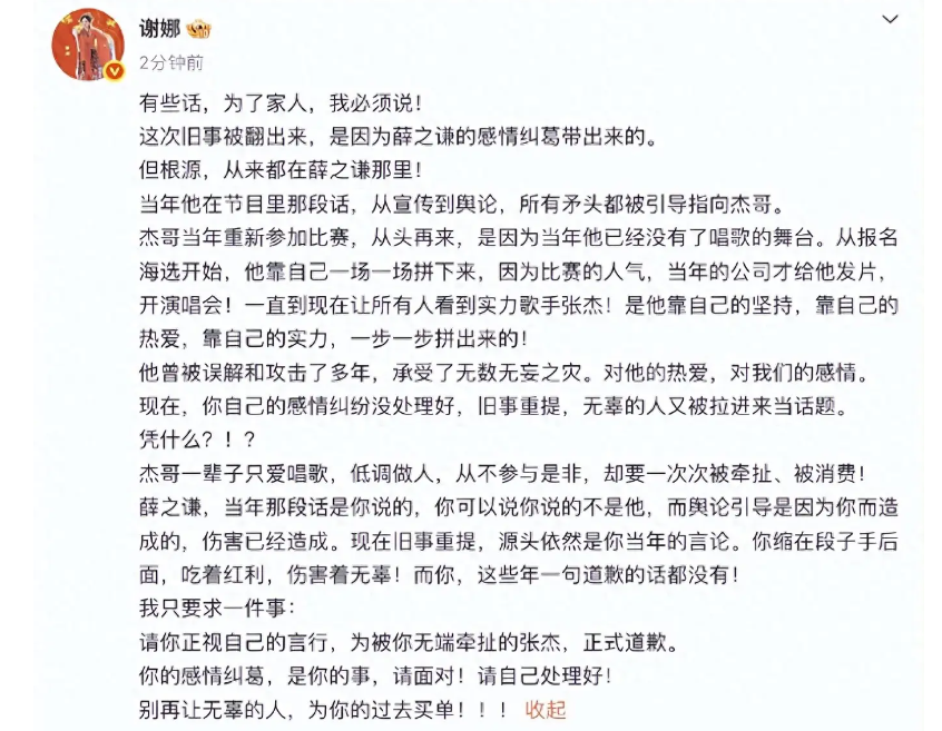 谢娜在文中直指薛之谦躲在“段子手”人设背后,却从未正视给张杰造成的伤害。“薛之谦,当年那段话是你说的……你缩在段子手后面,吃着红利,伤害着无辜!而你,这些年一句道歉的话都没有!”她明确要求薛之谦正视言行,为无端牵扯张杰一事正式道歉,并强调:“你的感情纠葛,是你的事……别再让无辜的人,为你的过去买单!!!”