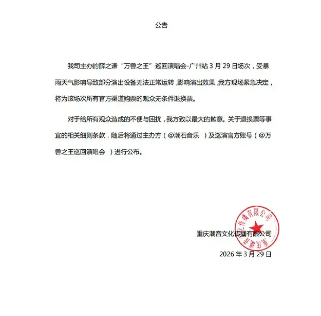 Yes娱乐3月30日讯 3月 29 日晚,薛之谦 “万兽之王” 巡演广州站突遇强对流暴雨天气,舞台灯光、音响及互动设备受雨水影响无法正常运转,演出效果未达预定标准。演出中途,薛之谦面向现场观众致歉并宣布重磅补偿方案,承诺为所有观众全额退票,同时为远道而来的歌迷报销机票与酒店费用,引发全网热议。