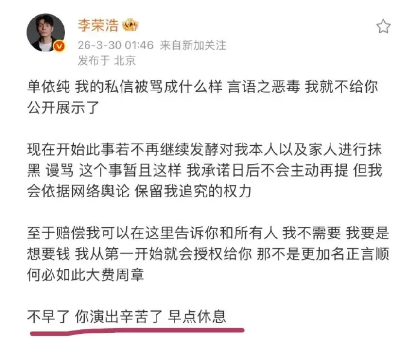 李荣浩随即回应,强调若为经济补偿,当初便会直接授权,因此明确拒绝赔偿。他表示维权核心是守护原创与版权底线,同时提醒行业恪守合规边界,尊重创作者权益。