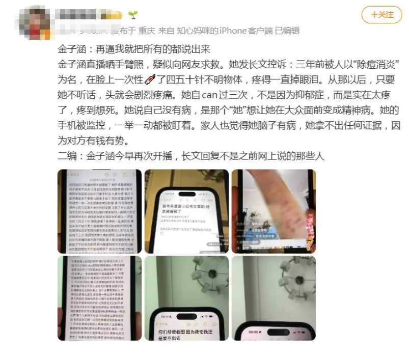 Yes娱乐4月9日讯 4 月 8 日深夜,前《青春有你 2》人气选手金子涵开启一场异常直播,全程情绪崩溃、不露脸,仅展示手臂新旧交错的伤痕,通过备忘录文字控诉惊人经历,引发全网震动。她自曝三年前被人以 “祛痘消炎” 为名,在脸部一次性注射 40-50 针不明物质,此后长期遭受身心折磨,更指控手机与居家行动被全程监控,陷入孤立无援的境地。