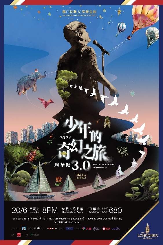 (中国澳门,2026年4月10日) – 华语乐坛歌王周华健将于2026年6月20日再度登陆澳门伦敦人® 的伦敦人综艺馆,带来“少年的奇幻之旅3.0”巡回演唱会澳门场。门票将于2026年4月14日(星期二)中午12时起通过金光票务、澳门售票网、大麦网、猫眼及uutix同步发售。