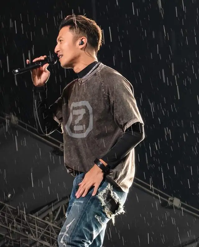 面对突发暴雨,谢霆锋拒绝工作人员递伞,身着深V黑T和破洞牛仔裤继续表演,雨水迅速浸透衣衫,他却始终全情投入,边弹边唱28首经典曲目,还反复提醒观众“穿好雨衣,别感冒”。期间,他在劲歌热舞时,牛仔裤臀部破洞意外露出一截底裤,上面的玉蝴蝶印花清晰可见,与他的经典代表作《玉蝴蝶》形成巧妙呼应。