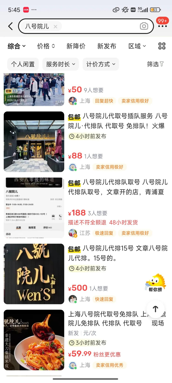 Yes娱乐4月15日讯 近日,演员文章在上海开设的陕西风味面馆“八号院儿”持续爆火,开业仅数日便登顶点评平台上海陕菜热门榜榜首,旺盛的人气不仅催生了超长排队队伍,更衍生出高价代排队服务,最高叫价达500元,引发广泛关注。