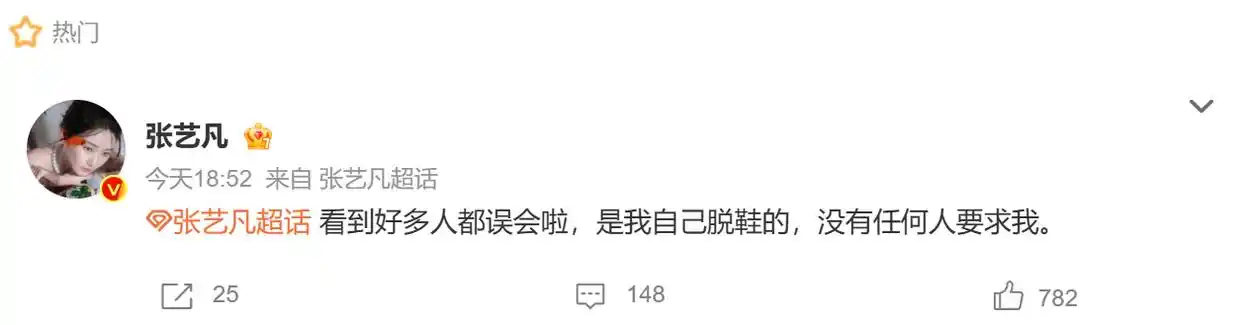 4月19日18时52分,张艺凡通过微博回应争议,语气亲切直白:“看到好多人都误会啦,是我自己脱鞋的,没有任何人要求我。”她补充说明,脱鞋仅发生在拍摄视频的短暂瞬间,现场地面铺有地毯,可保障安全,打消了网友对其安全问题的担忧。