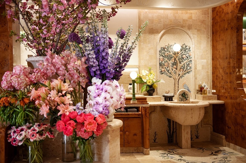 在当季鲜花、香氛家居中,野兽派店铺悉心陈列了很多油画、艺术品,均来自野兽派的收藏。店铺一角的马赛克洗手池,可以让客人沉浸式感受野兽派的个护产品,蜗牛趴在水龙头上,让洗手池变得像许愿池。在野兽派花店里,一种优雅从容的生活方式在空间内流淌,不经意间瞥见的花艺作品也总能让人感受到四季变化。